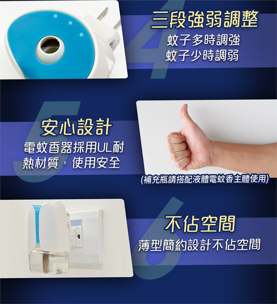 4. 雷達電蚊香器請搭配雷達液體電蚊香重裝瓶使用,以確保使用安全及除蚊效果。(薄型電蚊香器請搭配薄型補充瓶使用)