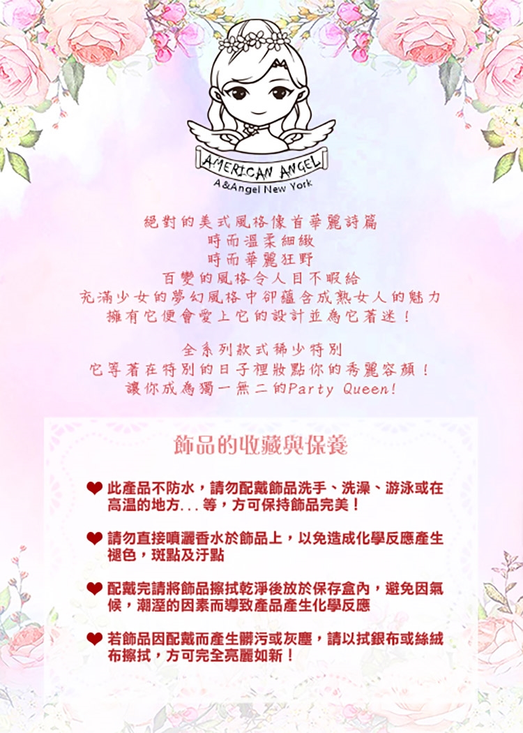 * 飾品屬於消耗品,會隨時間、穿戴方式、汗水接觸、化學物質沾染(沐浴用品、香水等等)、保存方式、碰撞頻率等不同而發生氧化、電鍍層磨損、降低光澤、邊角磨損,甚至斷裂損壞。