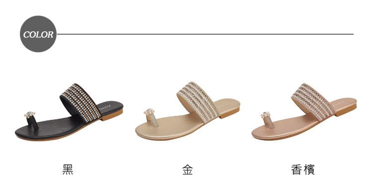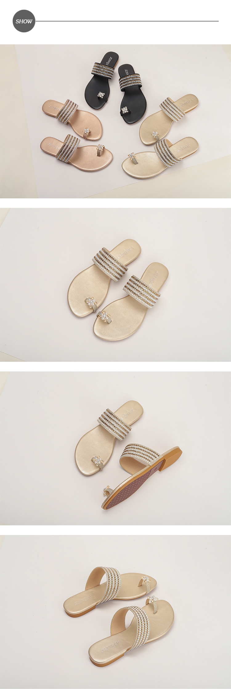 【QUEENA】珍珠花朵趾環低跟拖鞋/閃耀珍珠貼片花朵趾環一字帶設計低跟拖鞋 女鞋 金