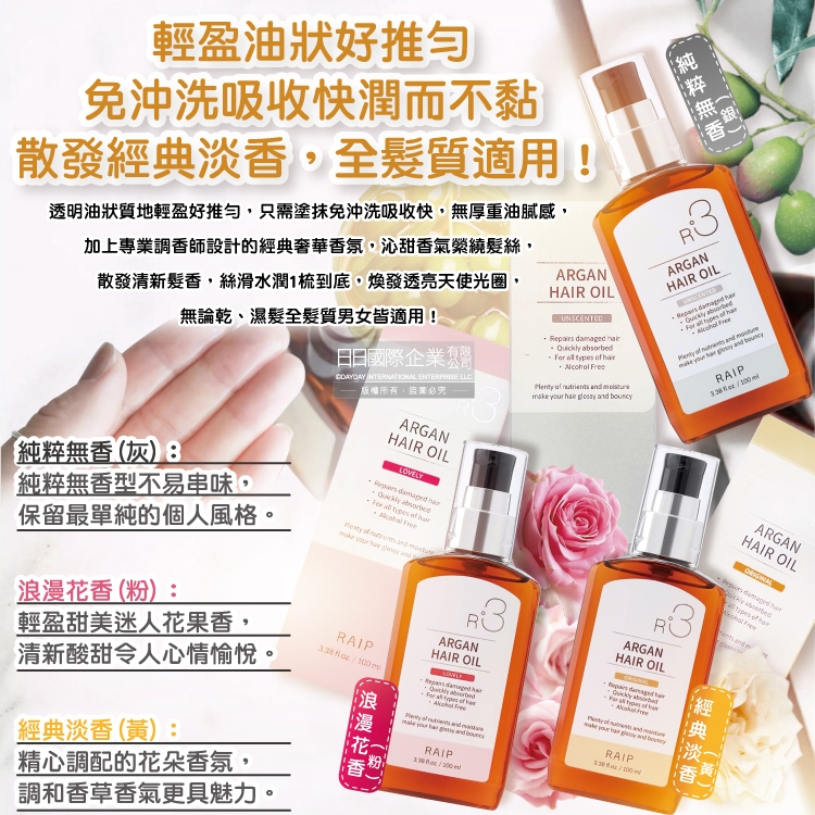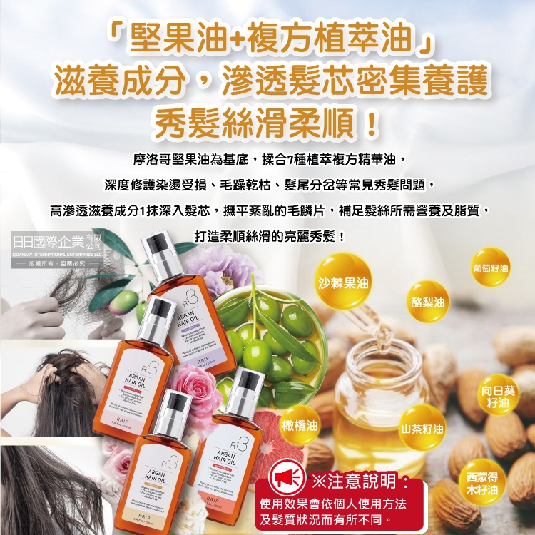 ●品名:R3菁粹摩洛哥堅果油免沖洗滋養柔順香氛護髮油