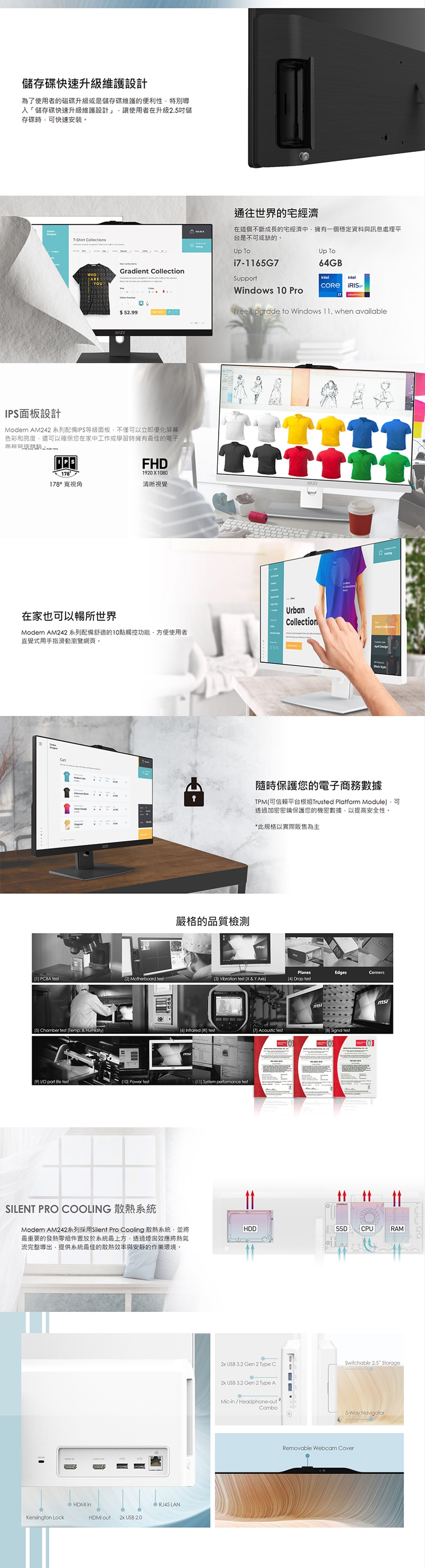 | I/O連接埠 | 側面: 2x USB 3.2 Gen 2 Type C 2x USB 3.2 Gen 2 Type A 1x Mic-in /Headphone-out combo 背面: 1x HDMI-in 1x HDMI-out 2x USB 2.0 Type A 1x RJ45 LAN |