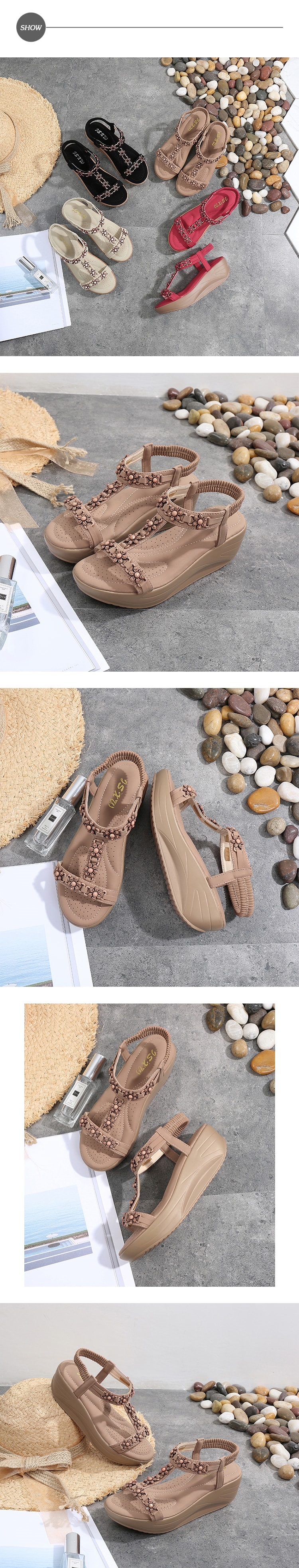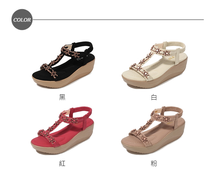 【QUEENA】復古花朵串珠工字坡跟涼鞋/波西米亞民族風復古花朵串珠工字造型坡跟厚底涼鞋 女鞋 粉
