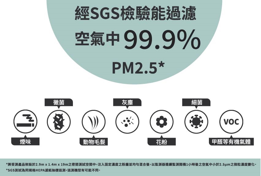 HEPA濾網有效過濾塵螨、灰塵、動物毛髮、PM2.5等空氣中微粒物