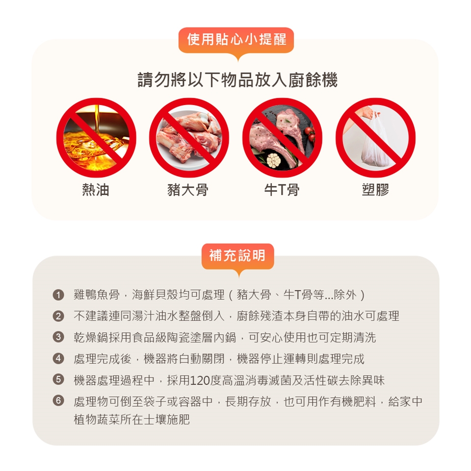 粉碎研磨/高溫烘乾/高溫消毒/除臭抑菌,使用有限制規定,請務必詳閱說明書。