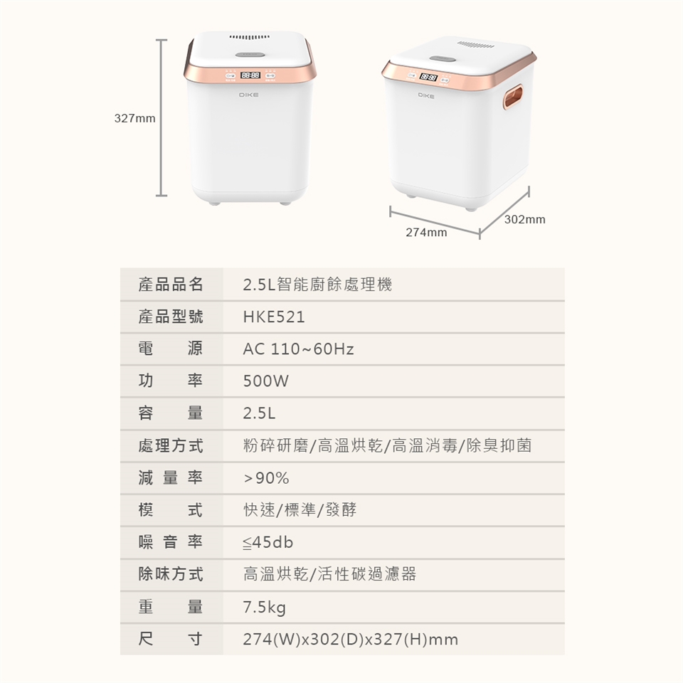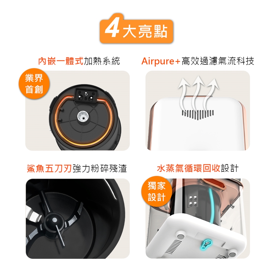 ●一鍵減少90%廚餘胎積粉碎研磨/高溫烘乾/高溫消毒/除臭抑菌一次完成。