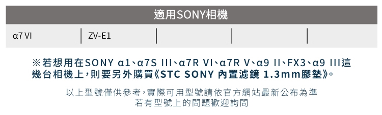 ●若想用在SONY A1、A7S III、A7R VI、A7R V、A9 II、FX3、A9 III這幾台相機上,則要另外購買《STC SONY 內置濾鏡 1.3mm膠墊》。
