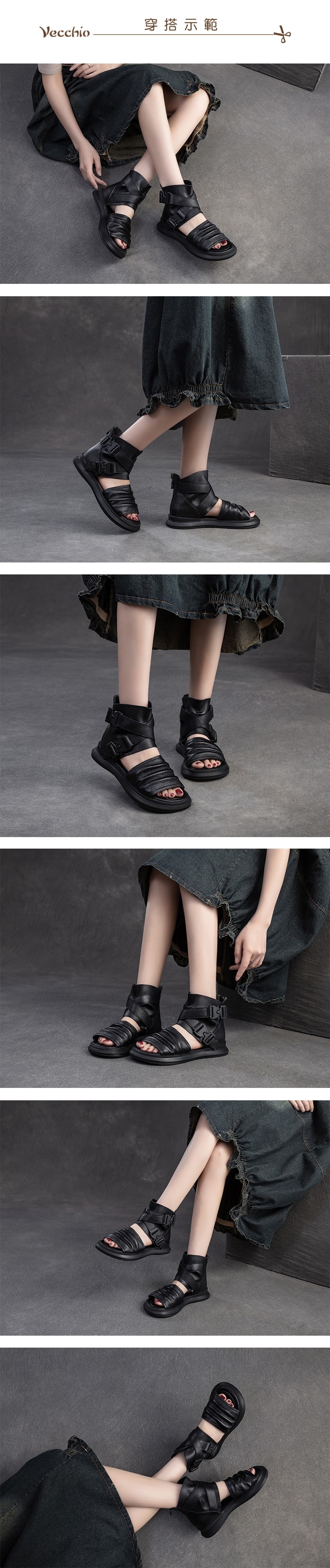 【VECCHIO】真皮釦帶厚底羅馬涼鞋/真皮頭層牛皮復古時尚釦帶厚底羅馬涼鞋 涼靴 女鞋 黑