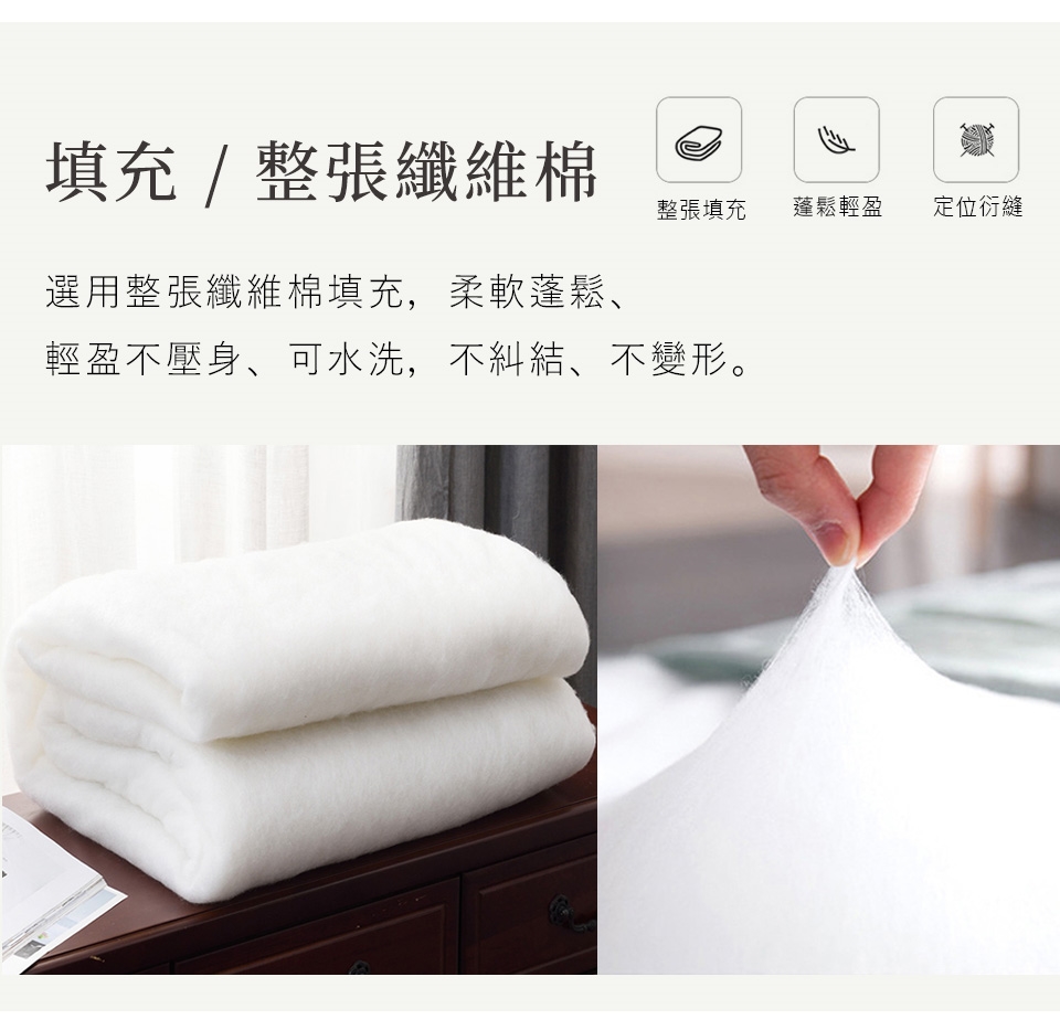 填充使用整張的纖維棉,被面平整、不易成團、輕盈不壓身,透氣排汗,使被子有出色的高透氣性。