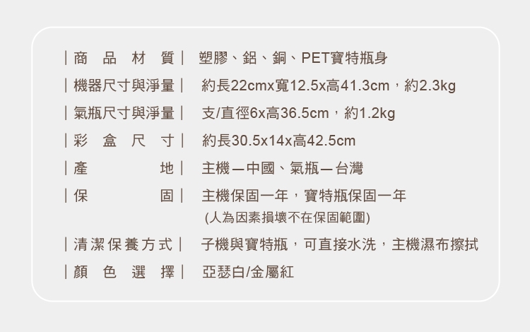 保固期限:主機保固1年,寶特瓶保固1年(人為因素損壞不在保固範圍)