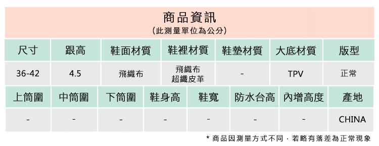 2.鞋類商品依功能及用途之不同,鞋底各有其止滑係數之個別不同,使用鞋類商品請用於正常平坦之路面,非雨鞋或雨靴類商品,請避免穿著於下雨濕滑路面上行走。
