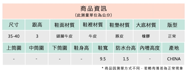 2.鞋類商品依功能及用途之不同,鞋底各有其止滑係數之個別不同,使用鞋類商品請用於正常平坦之路面,非雨鞋或雨靴類商品,請避免穿著於下雨濕滑路面上行走。