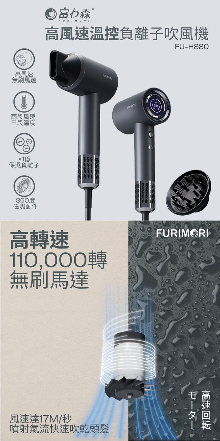 ★ 110,000rpm高轉速無刷馬達,超高速噴射氣流快速乾髮