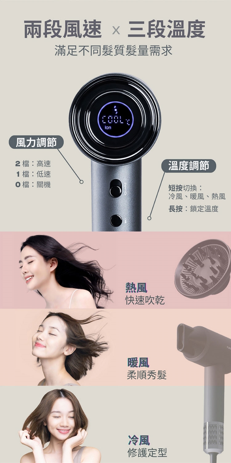 ★ 二段風速/三段溫度控制,滿足不同髮質髮量需求