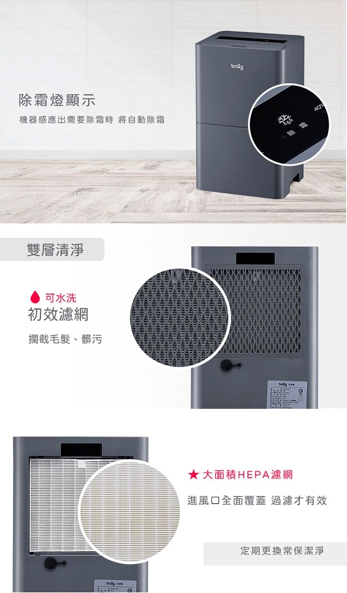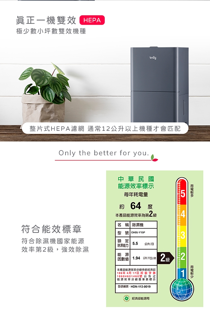 ※ 本款除濕機清淨能力,依標準規範實測CASR值為1.12,因以除濕為主,附加清淨為輔,並無單獨清淨,所以無另行申請清淨機能效分級標示。