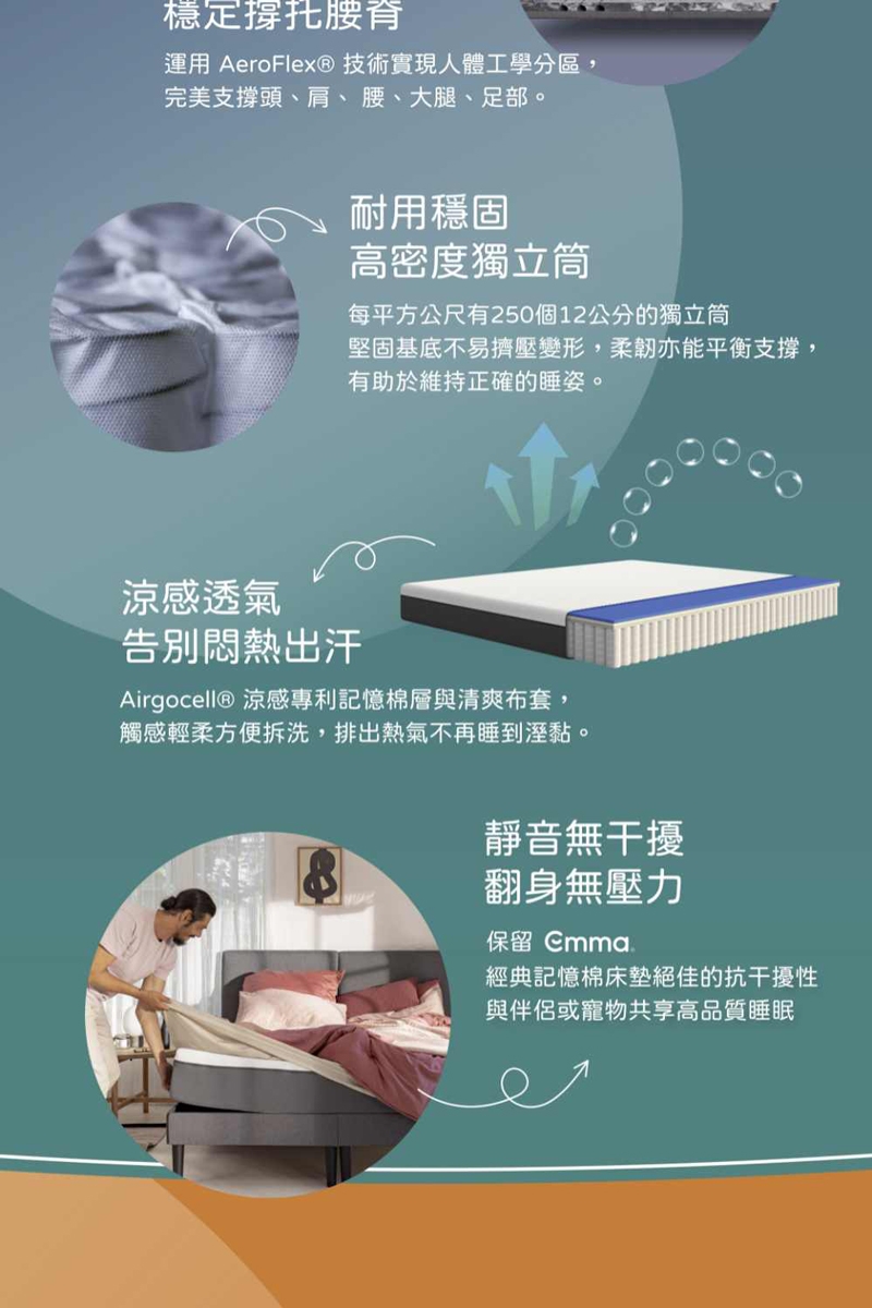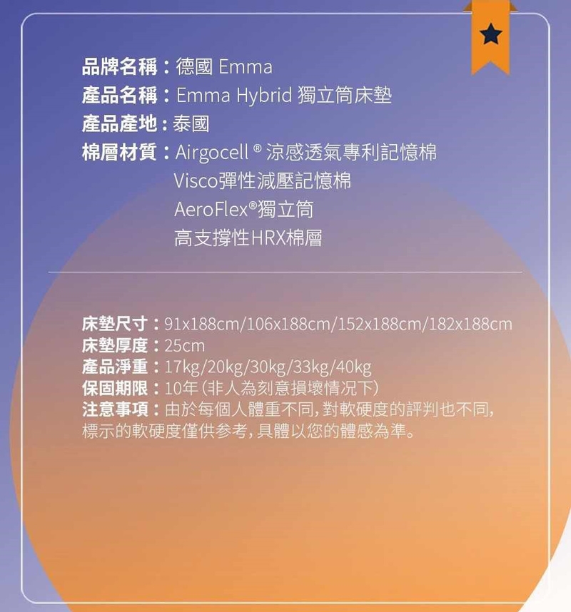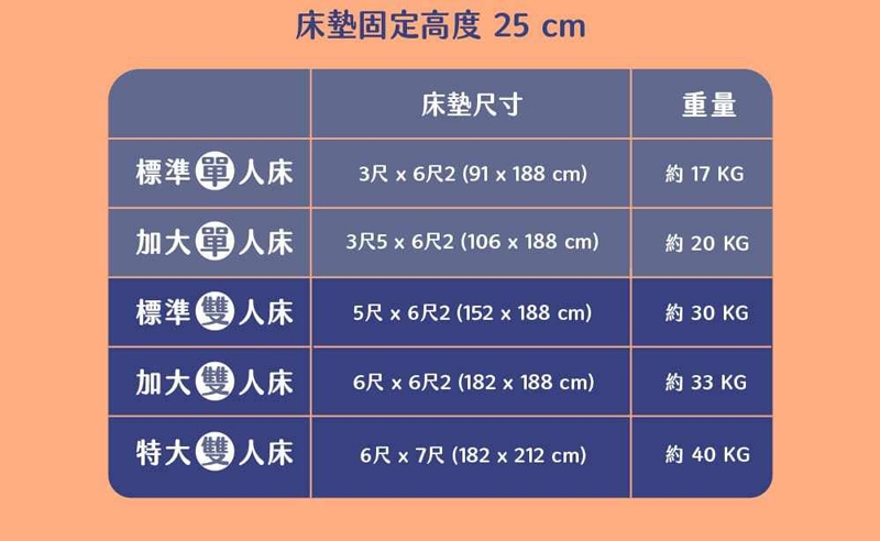 - 加大單人床:3尺5 x 6尺2 (106 x 188 cm) 約 20 KG