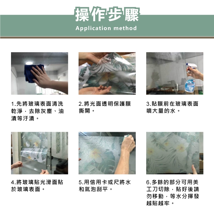 (1)先將玻璃擦拭清潔,貼膜前於玻璃表面噴水。
