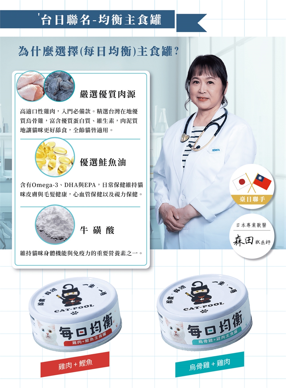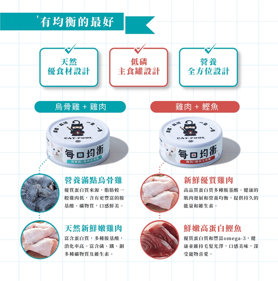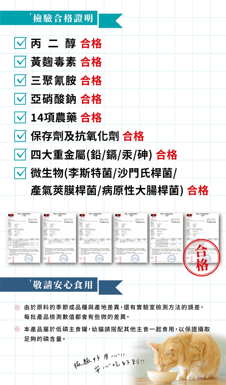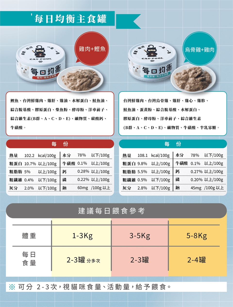 鰹魚、台灣鮮雞肉、雞肝、雞油、水解蛋白、鮭魚油、綜合胺基酸、膠原蛋白、柴魚粉、酵母粉、洋車前子、綜合維生素(B群、A、C、D、E)、礦物質、碳酸鈣、牛磺酸