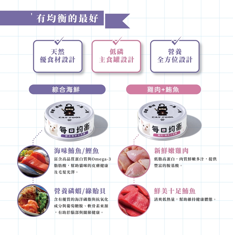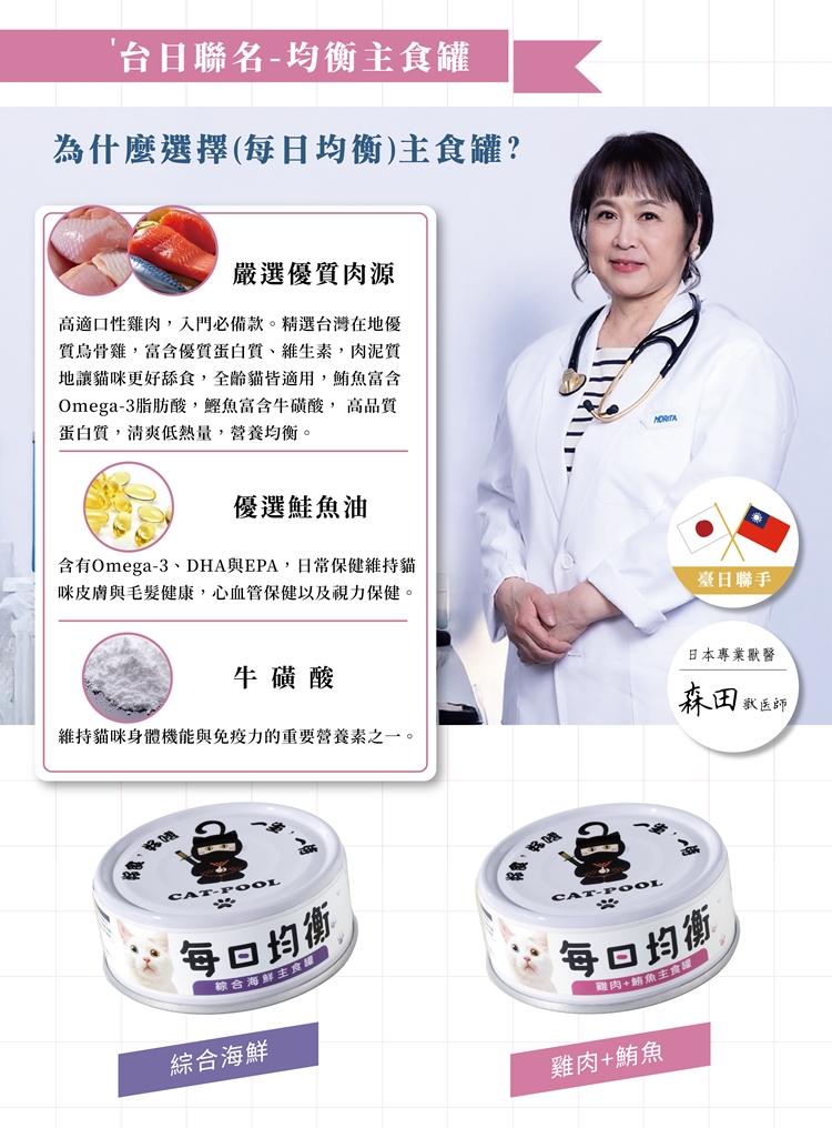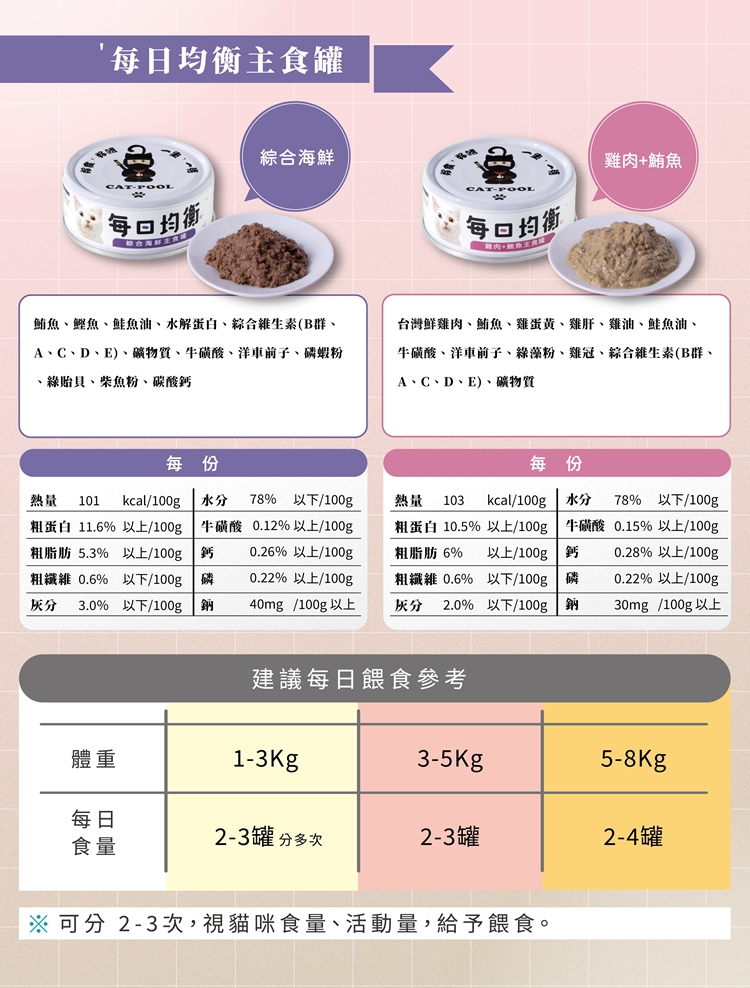 鮪魚、鰹魚、鮭魚油、水解蛋白、綜合維生素(B群、A、C、D、E)、礦物質、牛磺酸、洋車前子、磷蝦粉、綠貽貝、柴魚粉、碳酸鈣