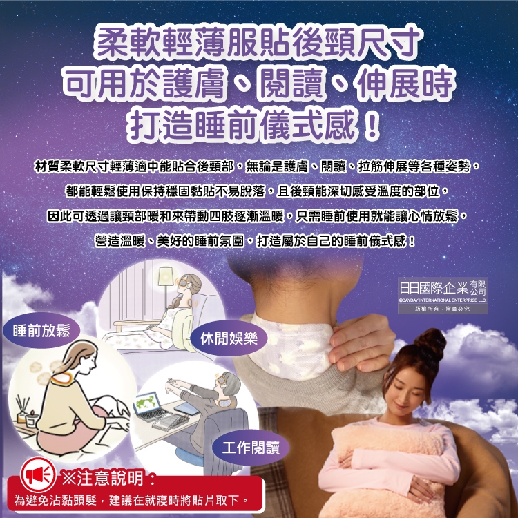 (7)建議就寢前使用完畢,避免熱敷貼沾黏頭髮。