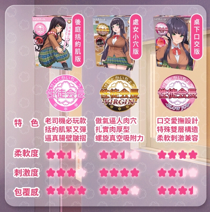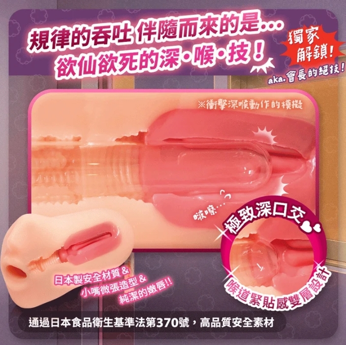 進入會長的櫻桃小嘴裡,彷彿來到未知的禁區,馬上感受到一股真空漩渦包覆感,將頭部到根部完美的狠狠吞噬、溫柔吸精,伴隨著抽插頂到仿真喉頭的深處,給你一種欲仙欲死的絕妙體驗,有別於一般口交的深度,會長大人的嘴巴可是有著橫紋遍布、二段扭曲的頂級深喉嚨構造設計,每一次的深入,都會帶來前所未有的震撼快感,讓會長大人陪你,探索那些隱藏在桌底下的秘密與愉悅吧 ♪
