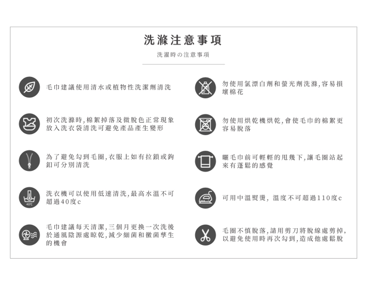 ※請勿使用高溫烘乾毛巾,亦勿以熨斗整燙毛巾,以免毛巾纖維受損,破壞吸水力。