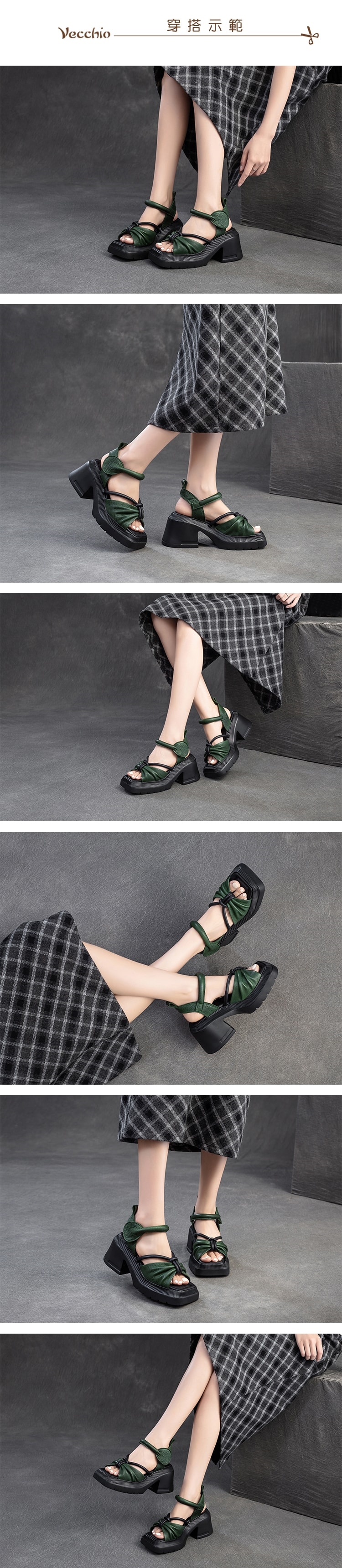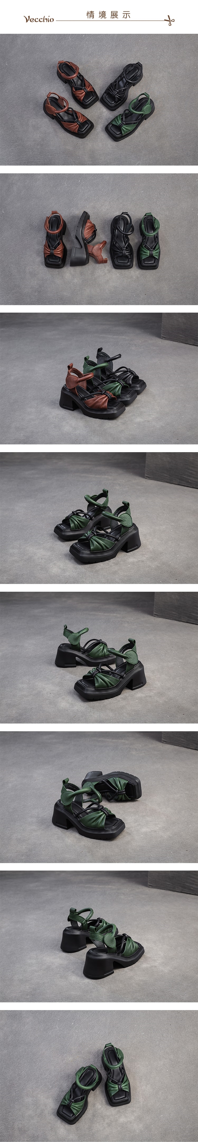 【VECCHIO】真皮撞色方頭蝴蝶結厚底高跟涼鞋/真皮頭層牛皮撞色方頭蝴蝶結繫帶防水台厚底高跟涼鞋 女鞋 綠
