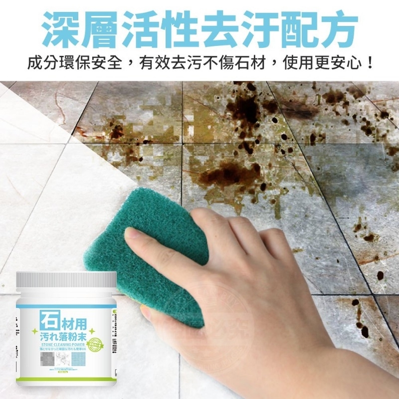 將20-30g石材清潔粉倒在乾淨的清潔刷布上,反覆擦拭石材污漬處,即可清除污漬,光亮如新。