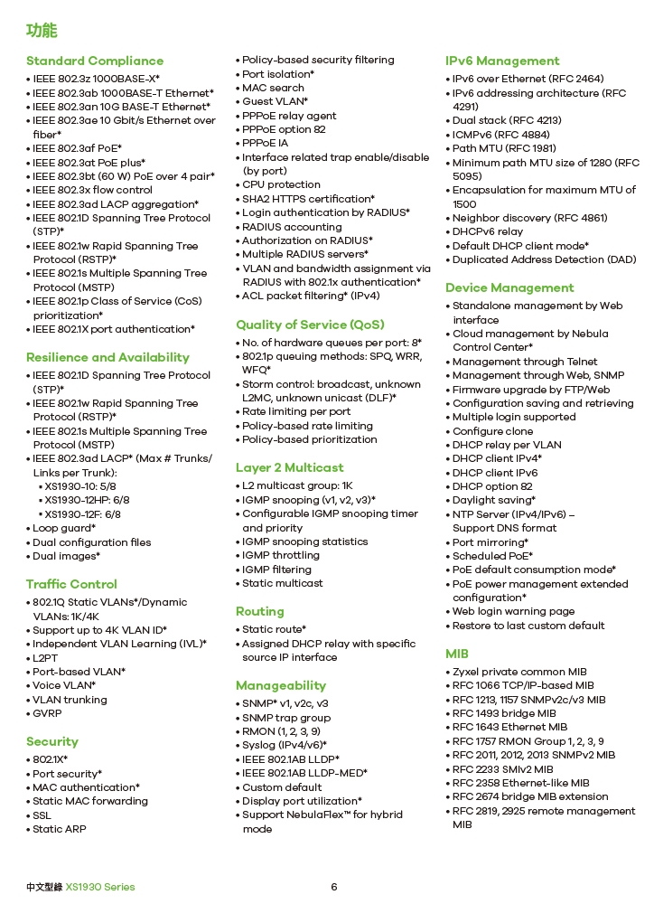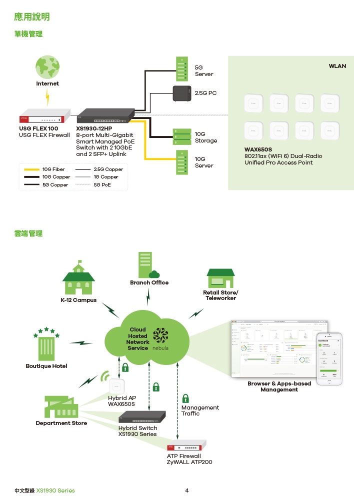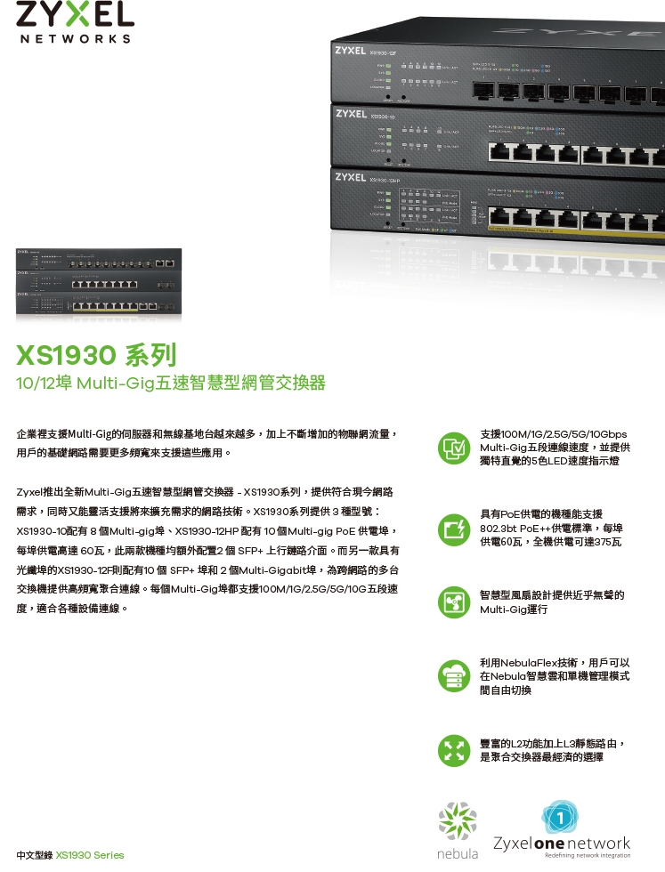 XS1930系列支援NebulaFlex技術,提供靈活的管理,用戶可以選擇Zyxel Nebula雲端管理平台免費基礎版(Base Pack),進而根據需求升級成專業企業版(Pro Pack),或根據環境需求設成單機模式。NebulaFlex允許用戶隨時切換管理模式,無需支付額外費用,保護有線網路的投資。