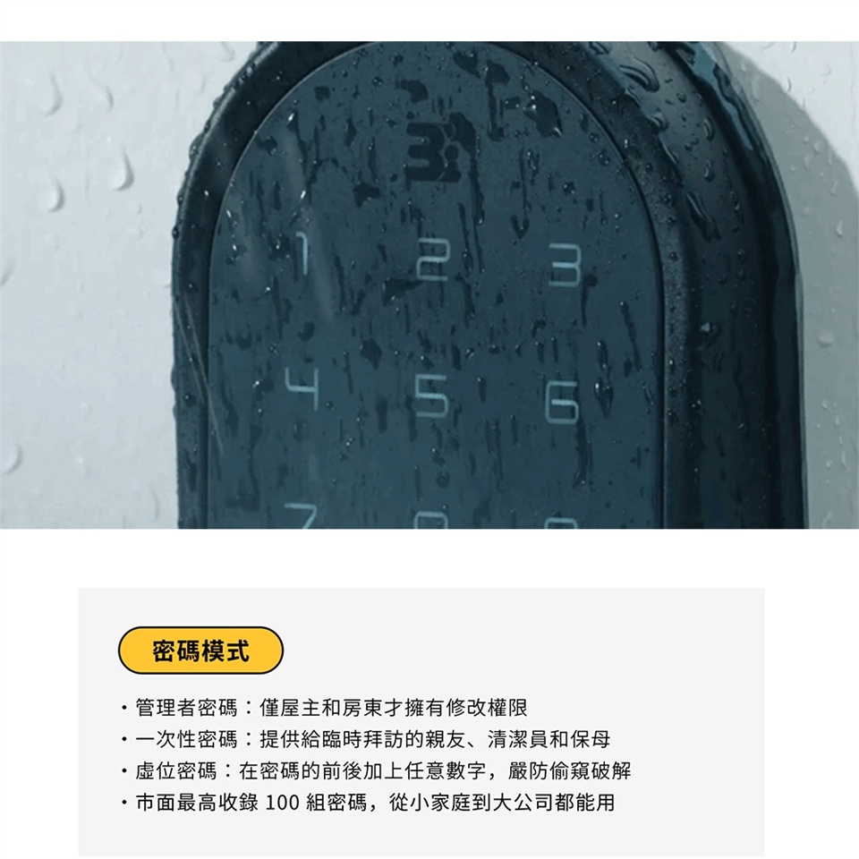 ◆IP65 防水係數,經過兩道防潮處理,提高電子鎖 200 % 的防潮耐受程度。