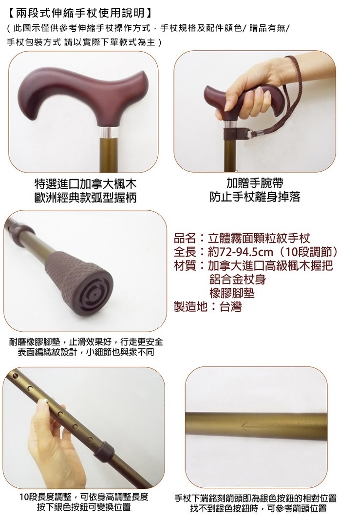 - 手杖長度調整範圍:約72-94.5公分