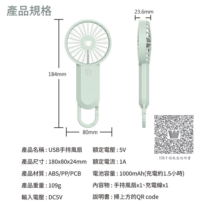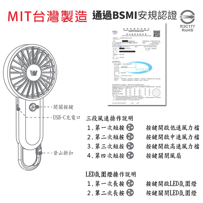 Wildex 手持式 USB充電隨身風扇(三段可調速)