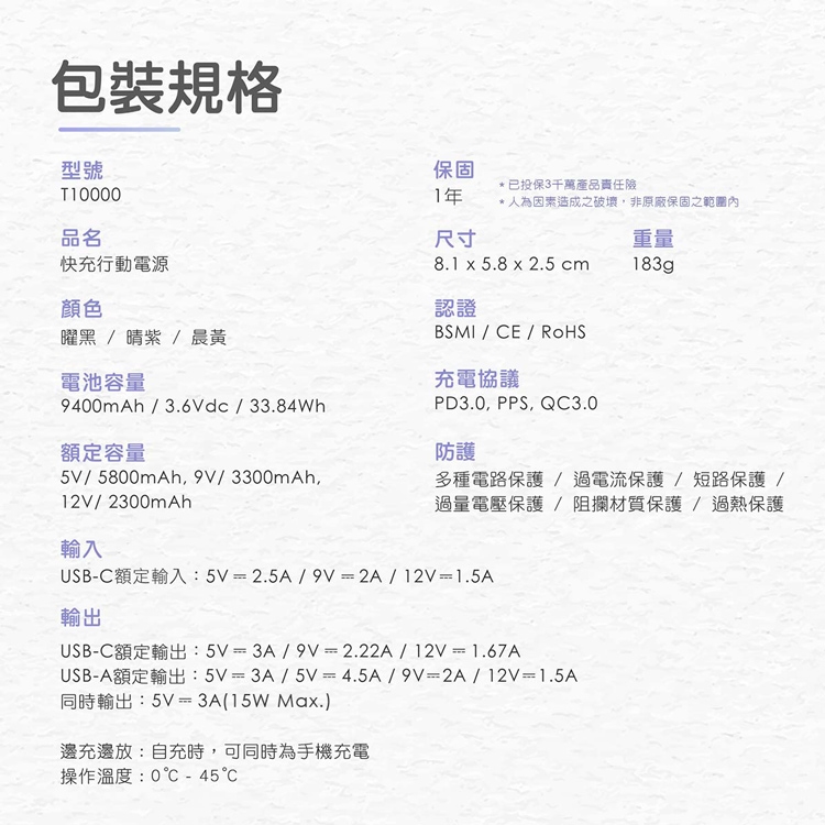 額定輸出電壓/電流USB-A:5V⎓3A / 5V⎓4.5A / 9V⎓2A / 12V⎓1.5A