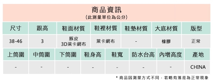 2.鞋類商品依功能及用途之不同,鞋底各有其止滑係數之個別不同,使用鞋類商品請用於正常平坦之路面,非雨鞋或雨靴類商品,請避免穿著於下雨濕滑路面上行走。