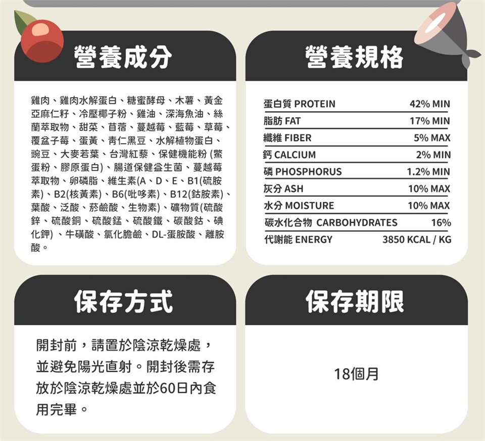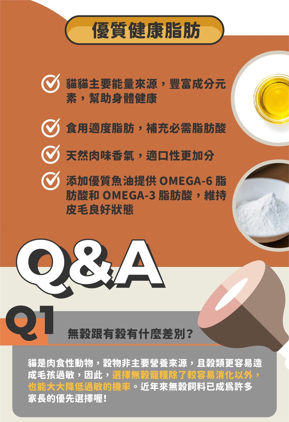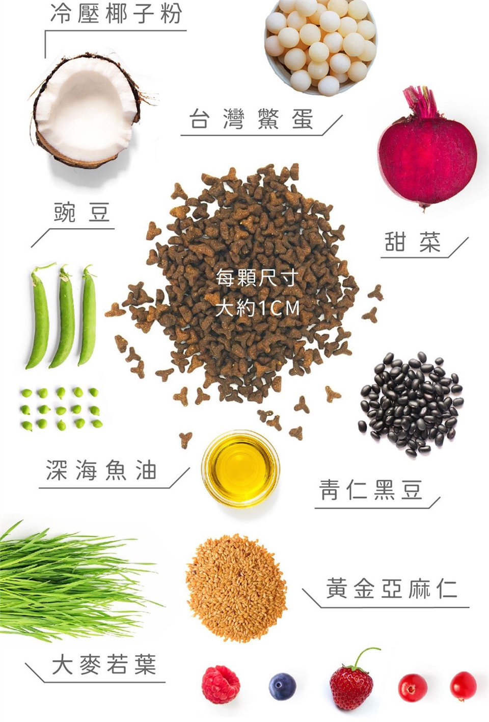 4.添加優質魚油提供omega-6脂肪酸和omega-3脂肪酸以及鱉蛋粉、膠原蛋白及卵磷脂,維持皮毛良好狀態