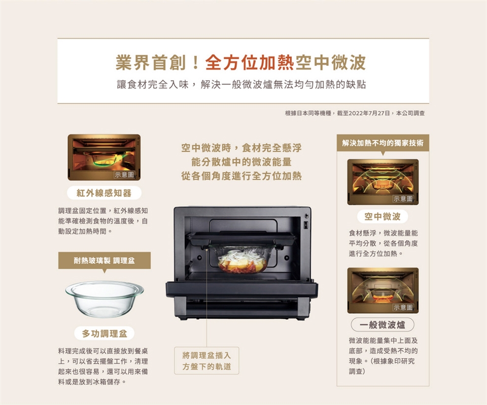 (1)首創空中微波,食材懸浮從各個角度全方位加熱。
