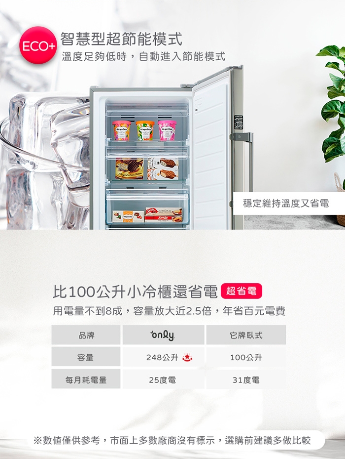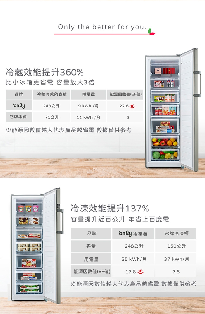 能源因數值(EF值): 冷藏 27.6ℓ/kWh/月 冷凍 17.8ℓ/kWh/月
