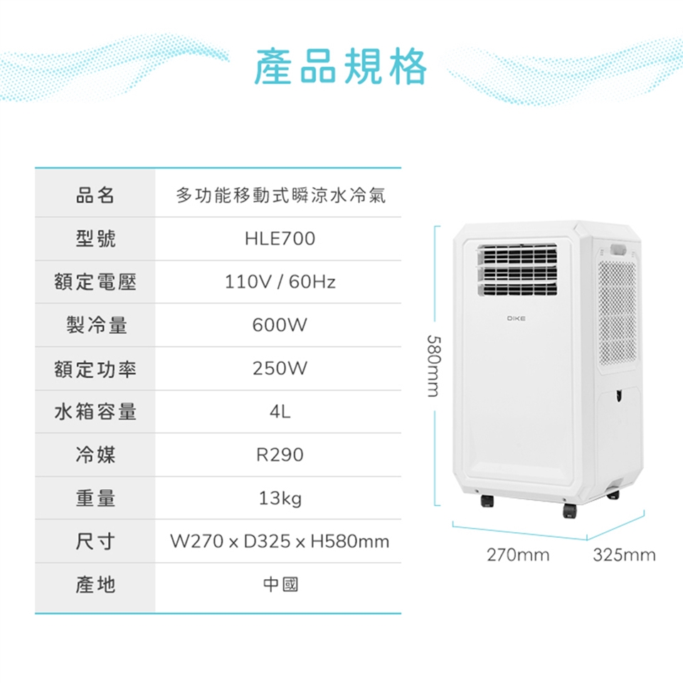 DIKE 多功能移動式瞬涼水冷氣 HLE700WT