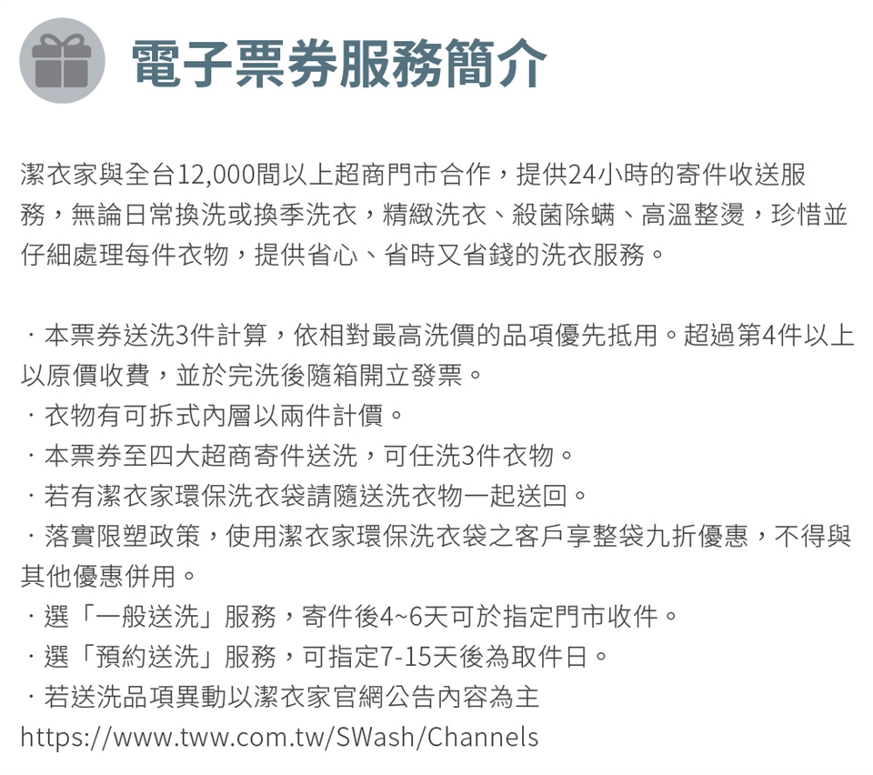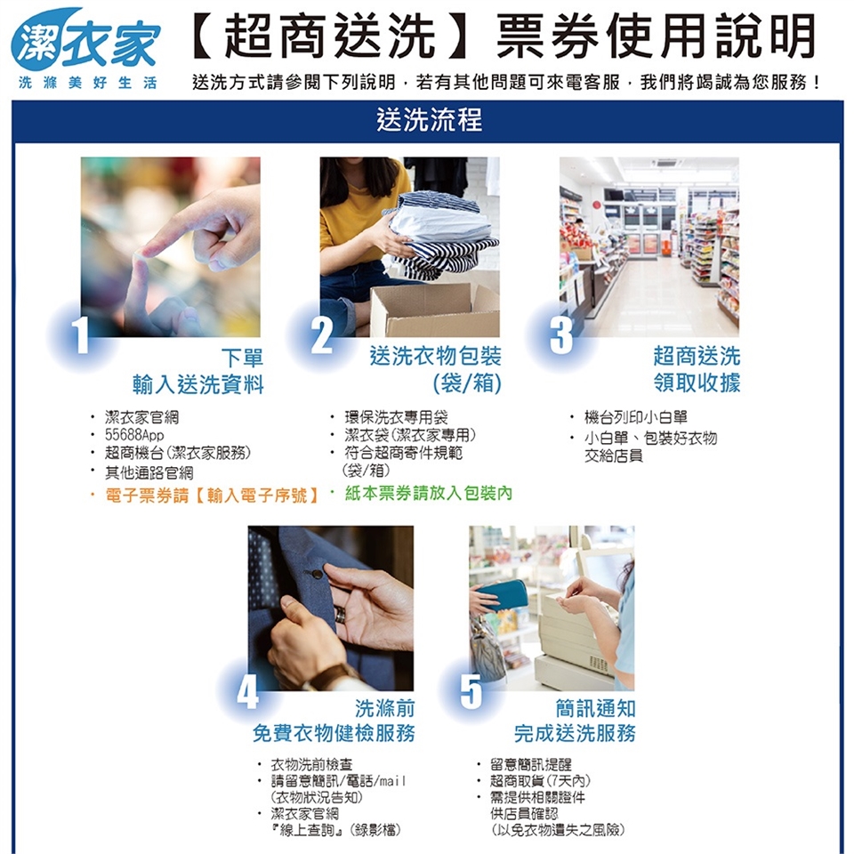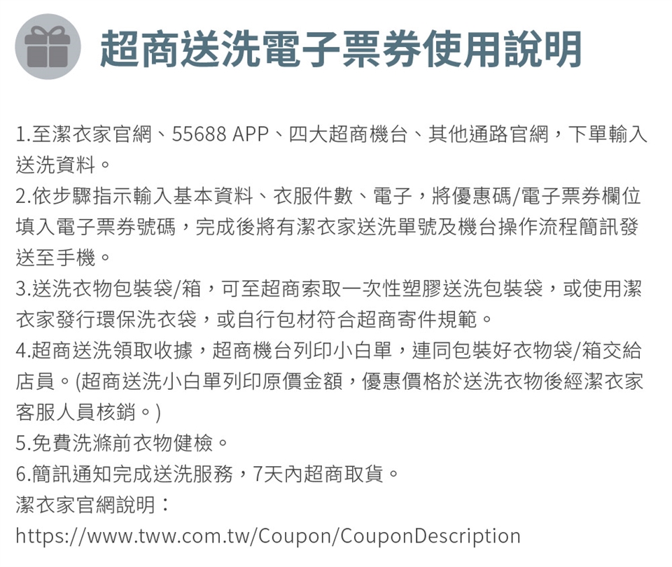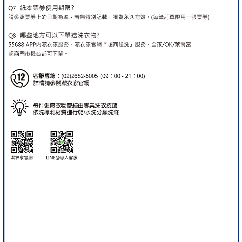 【使用注意事項】 ◎不得與其他優惠合併使用,恕無法兌換現金及找零 ◎請持手機簡訊或e-mail兌換券到潔衣家官網、55688APP下單輸入序號使用 ◎兌換券逾期未使用,可辦理退費。 以上規範如與兌換券不同,則依兌換券為準。