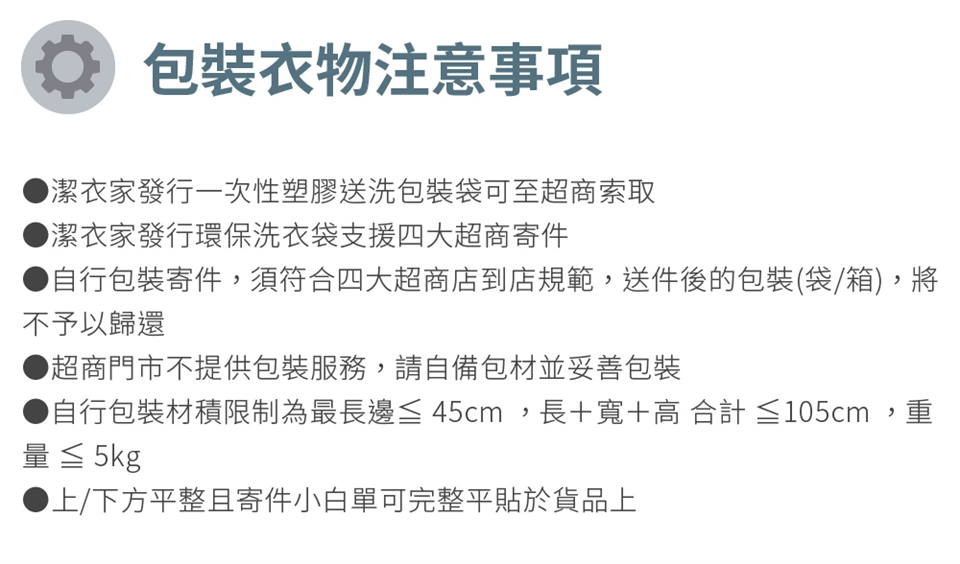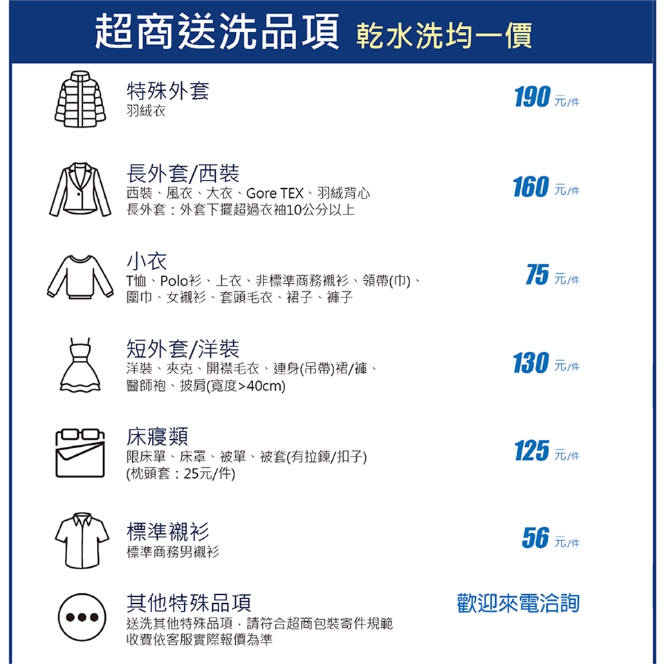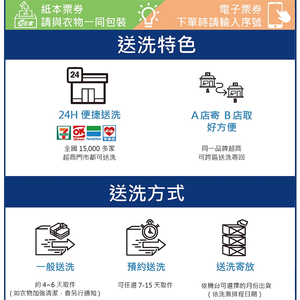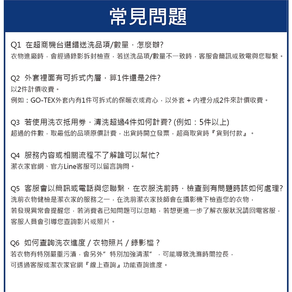 【使用注意事項】 ◎不得與其他優惠合併使用,恕無法兌換現金及找零 ◎請持手機簡訊或e-mail兌換券到潔衣家官網、55688APP下單輸入序號使用 ◎兌換券逾期未使用,可辦理退費。 以上規範如與兌換券不同,則依兌換券為準。