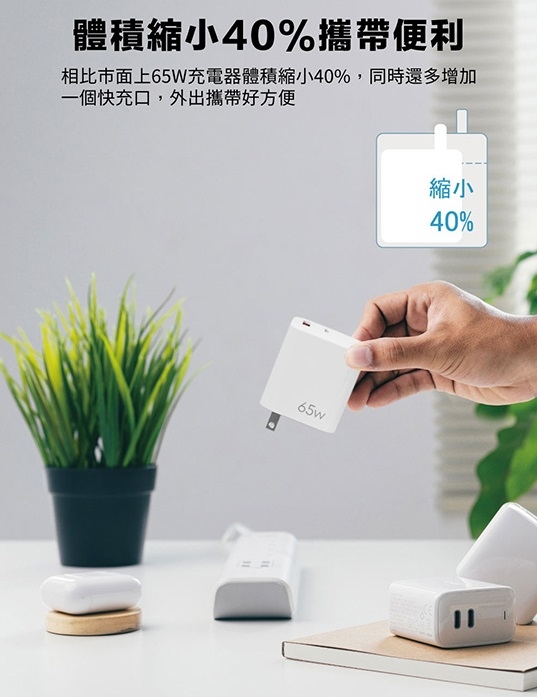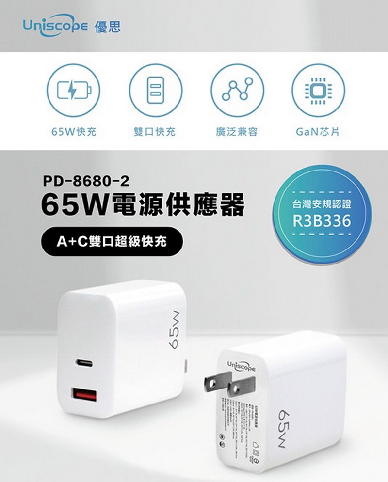 輸出:USB-C: 5V=-3A,9V=-3A, 12V =-3A, 15V=-3A,20V =-3.25A,65W max (PPS) 3.3V-21V=.3AUSB-A : 5V=3A,9V=-2A, 12V=1.5A, 18W max