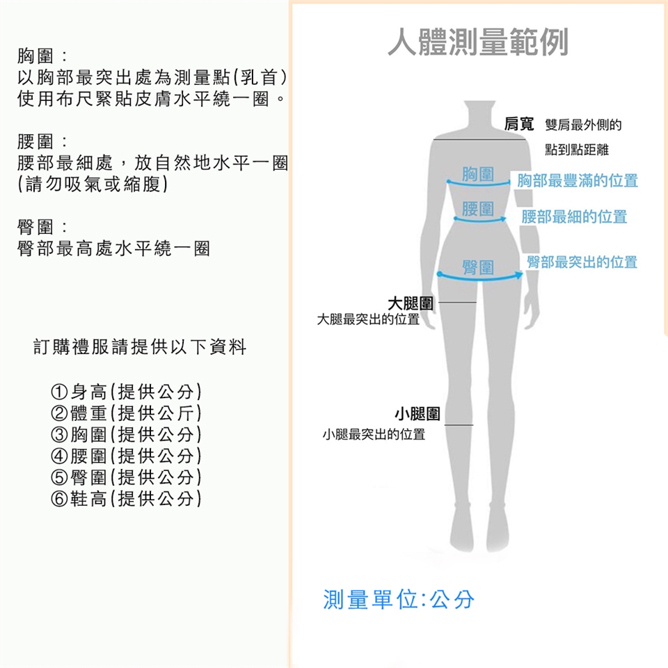 ☆白紗,晚禮服為選擇尺碼訂製商品請確認好身高,體重,胸圍,腰圍,臀圍(以公分為單位),由于測量方式以及尺寸參考度不同,手工測量會存在誤差約正負1-3公分內為正常範圍哦,請參考尺寸圖。