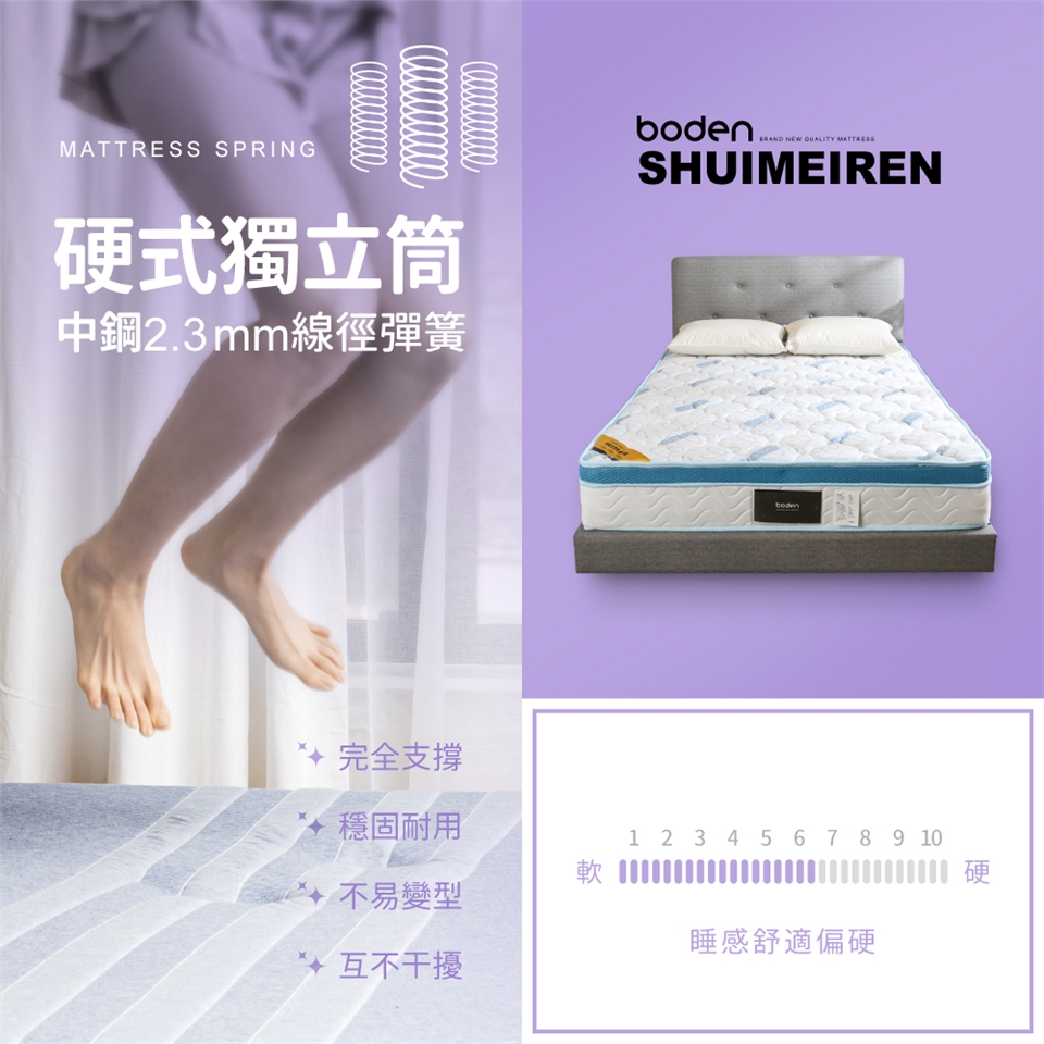 優質中鋼2.3mm硬式獨立筒彈簧,支撐力與耐用度更升級,提供您舒適的睡眠體驗!