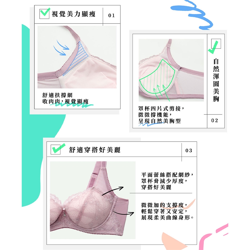 罩杯四片式剪接,微微撐機能,呈現自然美胸型;舒適扶撐網~美力顯瘦,腋收肉,穿著腋乾二淨。