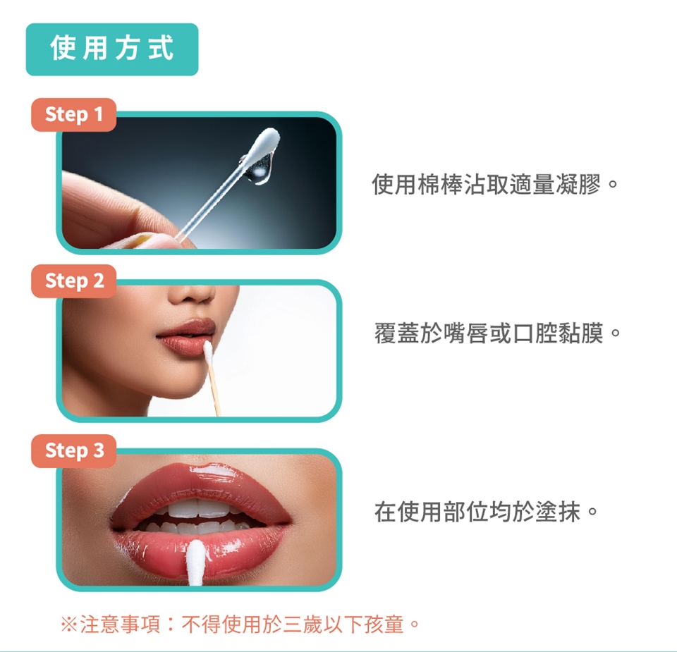 使用棉棒沾取適量凝膠,覆蓋於嘴唇或口腔黏膜,並在使用部位均於塗抹