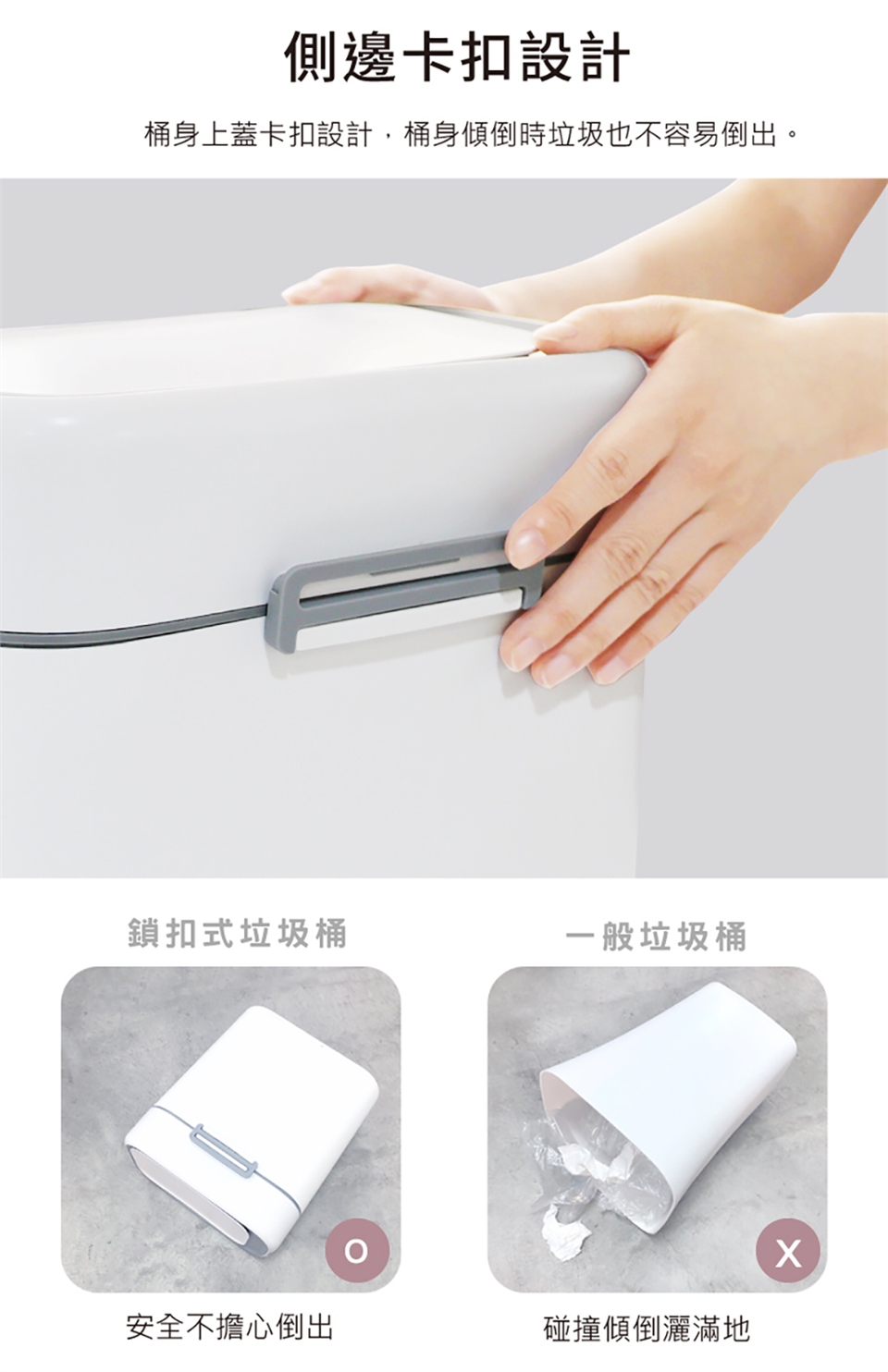 ◆側邊卡扣設計,傾倒時垃圾不掉出