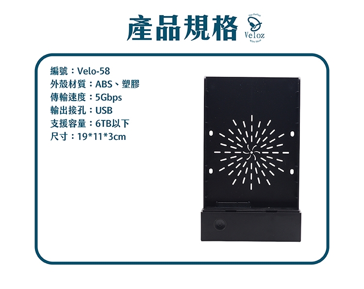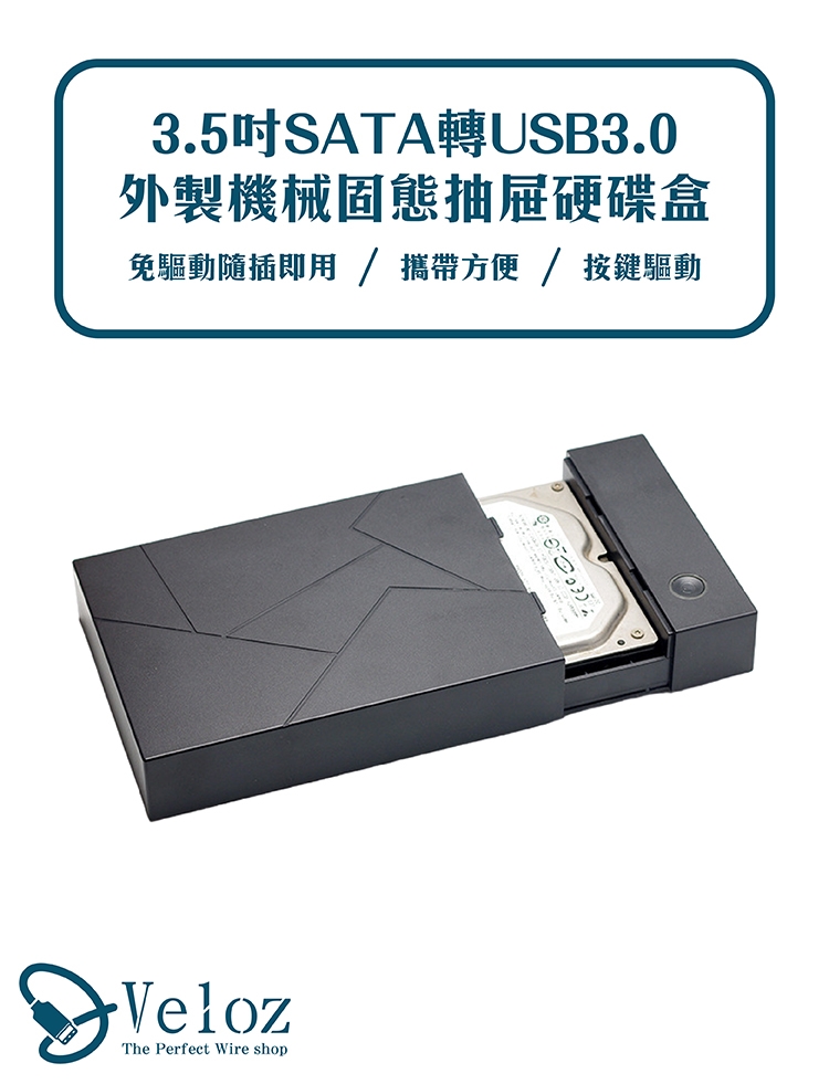 商品詳細介紹 USB3.0 3.5吋SATA 抽屜式HDD硬碟外接盒 產品底部配有螺絲可固定硬碟,可以成為方便攜帶的移動硬碟盒高速USB3.0接口,可向下支援USB2.0與1.1支援SATA硬碟,SATA Ⅲ代、SATAⅠ代開關設計:長按三秒開/關機 編號:Velo-58外殼材質:ABS、塑膠重量:371g傳輸速度:5Gbps輸出接孔:USB支援容量:6TB以下尺寸:19*11*3cm 體驗說明 不可體驗 使用方法說明 無 注意事項 無