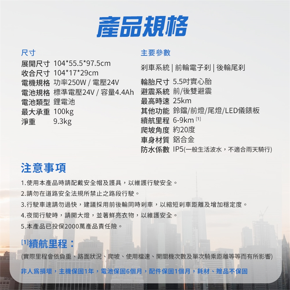 續航力:6-9km(實際里程會依負重,路面狀況,爬坡,使用檔速,