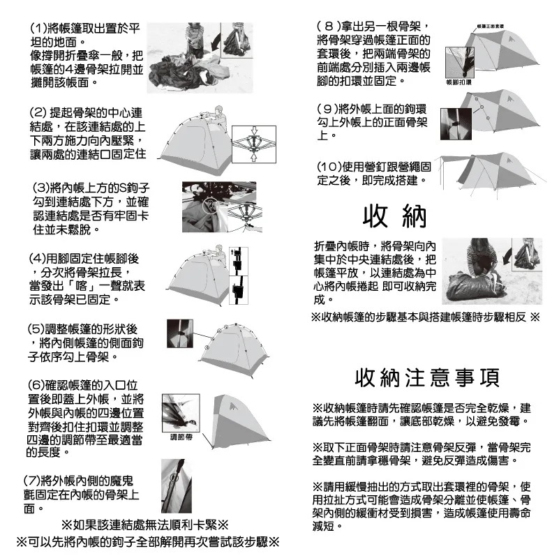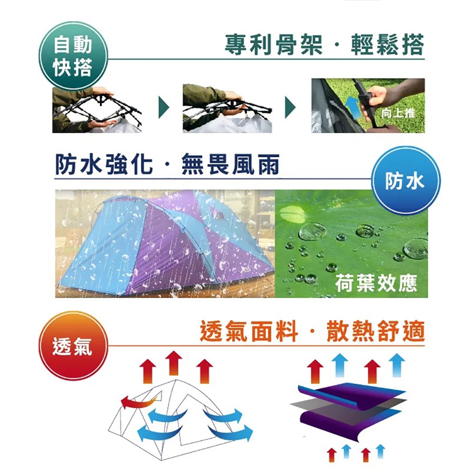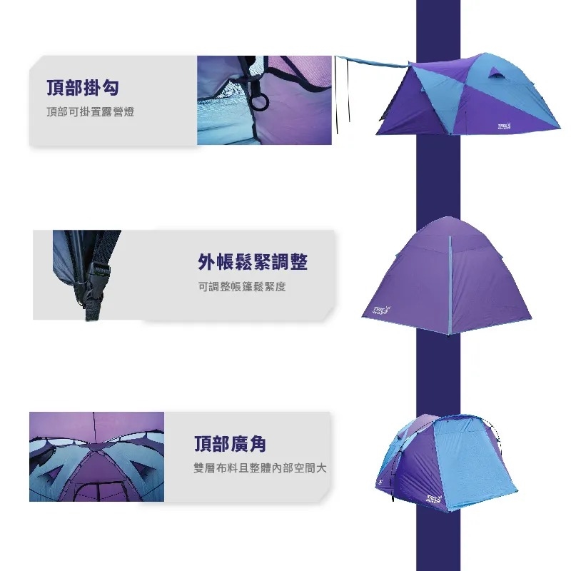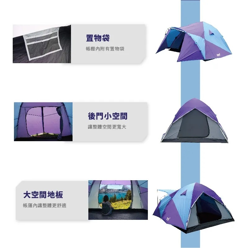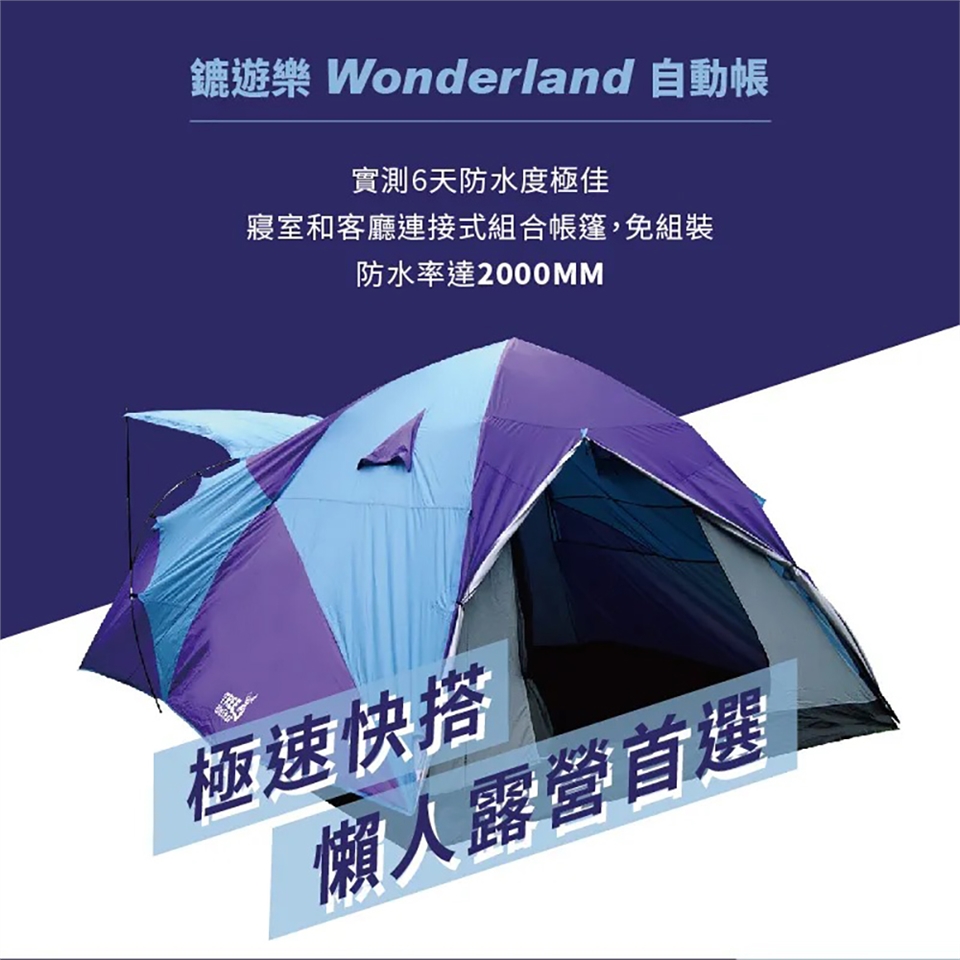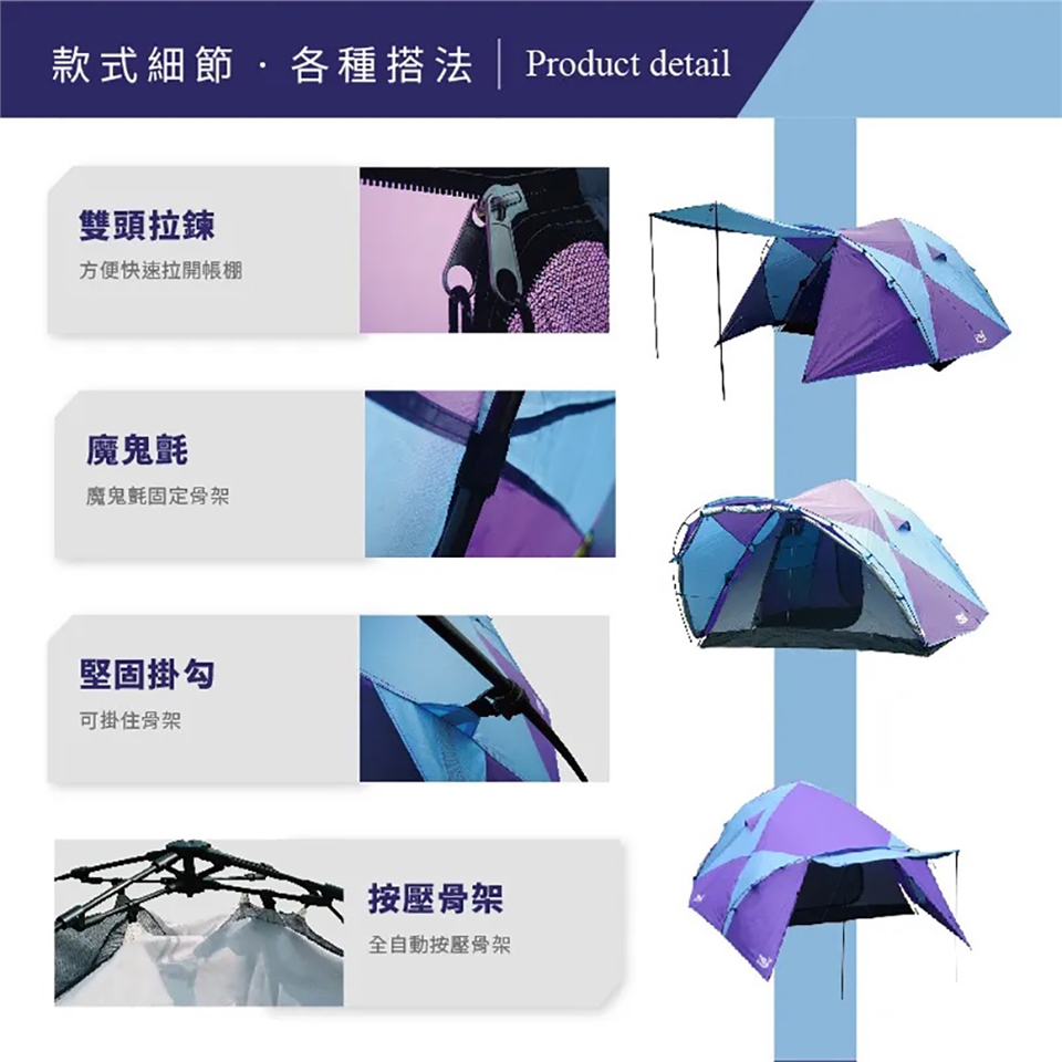 • 寢室和客廳連接式組合帳篷,免組裝。拉鍊加強