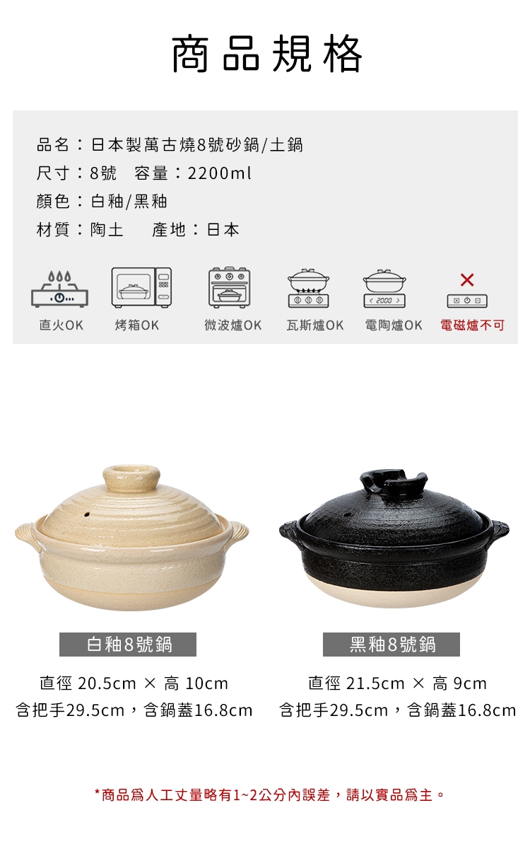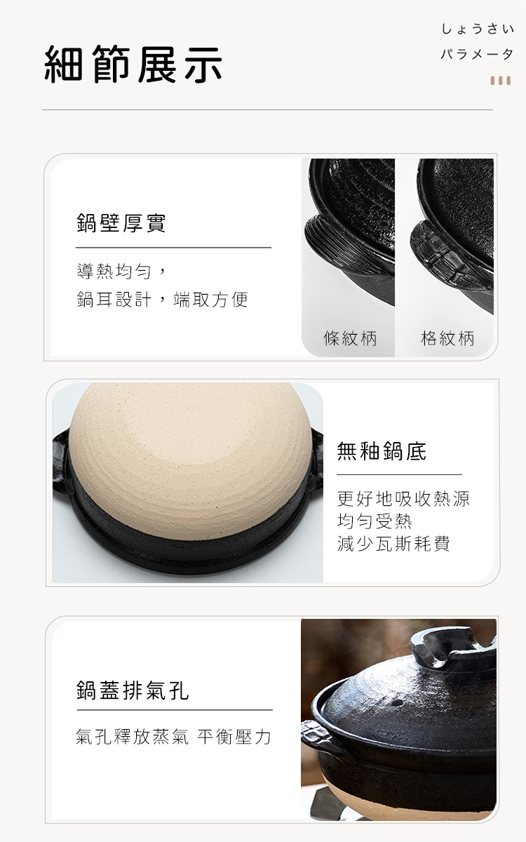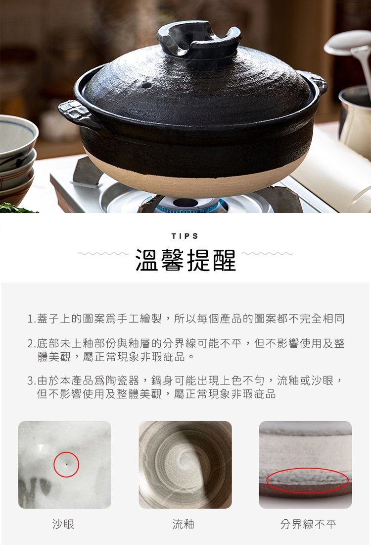 陶鍋會有顆粒、黑點、凹凸、上色不勻、流釉等現象!由於是手工製作,線條、紋理也會略有不同,屬正常工藝現象非瑕疵品!