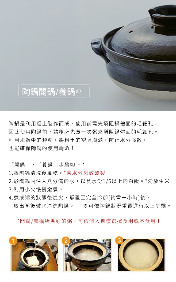 陶鍋是利用粗士製作而成,使用前需先填阻鍋體面的毛細孔,此使用陶鍋前,請務必先煮一次粥來塤阻鍋體面的毛細孔,利用米飯中的澱粉,將粗士的空隙填滿,防止水分溢散,也能確保陶鍋的使用壽命!
